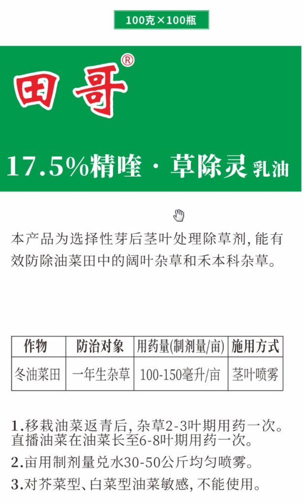 [使用技術要求]1.移栽油菜返青后,雜草2—3葉期用藥一次。直播油菜在油菜長至6—8葉期用藥一次。2.畝用制劑量兌水30—50公斤均勻噴霧。3.對芥菜型、白菜型油菜敏感,不能使用。4.油菜每個生長周期最多使用1次。
